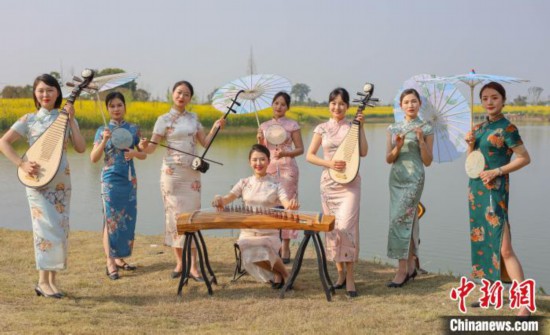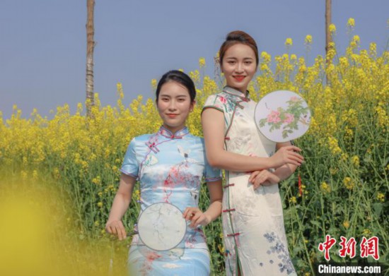 四川省の職業(yè)學(xué)院の女性教師たちが菜の花畑でチャイナドレスショー