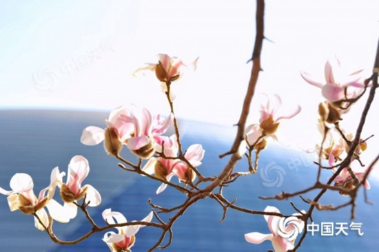 気溫が上がった北京で美しい花を咲かせるハクモクレン。