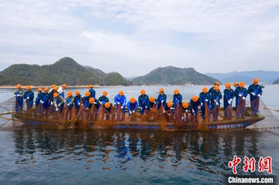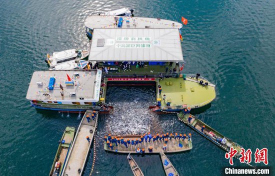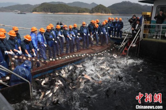 浙江省千島湖で今年初の「巨網(wǎng)捕魚」 水揚(yáng)げ量30トンの大漁