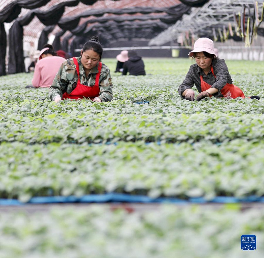 山東省臨沂市沂南県依汶鎮(zhèn)の野菜の育苗施設で作業(yè)に勤しむ農(nóng)民(1月4日撮影?杜昱葆)。