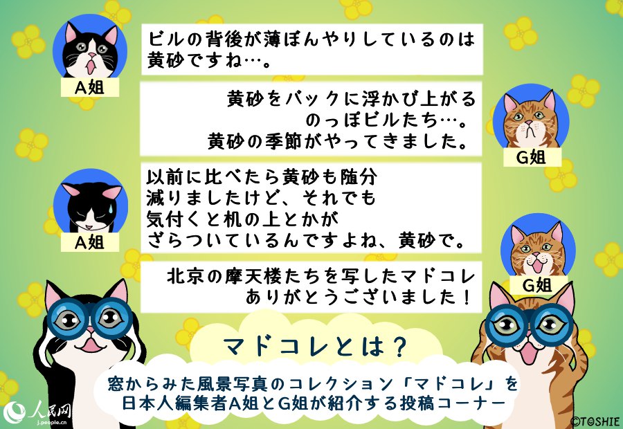 ウチのオフィスの窓からは、こんな風(fēng)景またはこんなモノが見えると自慢していただく「マドコレ(窓から見た風(fēng)景コレクション)」コーナー。どこまでも続く青い空や遠(yuǎn)くに見える山々といった自然の風(fēng)景から、オフィス街に建ち並ぶ高層ビルや幹線道路を走る車、庶民の暮らしが垣間見えるローカルな街並み、はたまた移動中の車窓からの眺めなどなど、高さや場所も異なれば、その窓から眺める風(fēng)景も千差萬別。中には仕事の意欲をアップさせてくれる元気の出る光景もあれば、疲れを癒してくれるほっこりした風(fēng)景も。そんな皆さまからお寄せいただいたマドコレの數(shù)々を、毎週火曜日に、人民網(wǎng)日本人編集者のA姐とG姐がコメントしながら、のんびり紹介していきます。