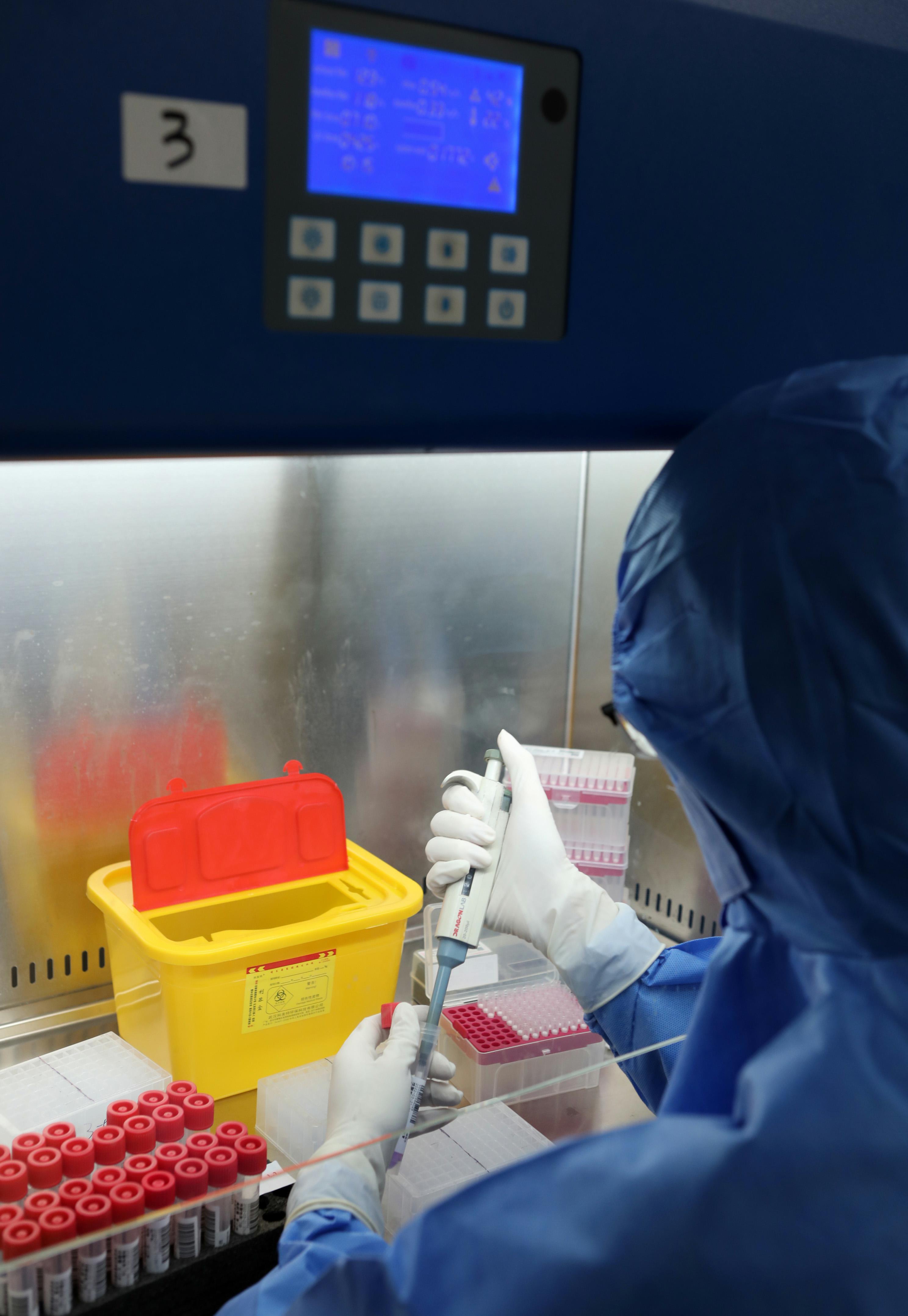 3月21日、PCR検査室で検體サンプルを試験管に入れる醫(yī)療スタッフ(寫真著作権は東方ICが所有のため転載禁止)。