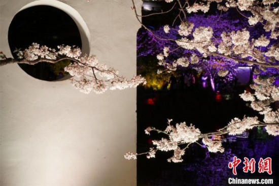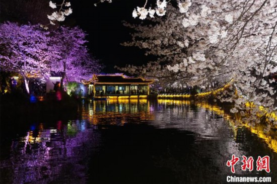 江蘇省無錫で撮影された太湖黿頭渚の夜桜(撮影?孫権)。