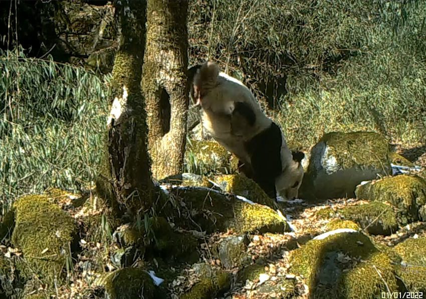 1つは今年1月1日に撮影された映像で、大人のオスのパンダが前足を地面についてから後ろ足を上げて木にもたれかかり、逆立ちの狀態(tài)で排尿していた。一見するとまるで「カンフーの技」を披露しているかのようにも見える。それから2ヶ月間、その赤外線カメラは何度もパンダがその木の匂いをかいだり、マーキングしたりする様子を捉えていた。