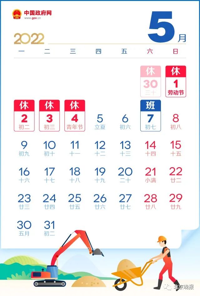 中國政府網によると、今年、中國では5月1日の「メーデー」に合わせて4月30日から5月4日までが5連休となり、4月24日(日曜日)と5月7日(土曜日)が振替出勤となる。