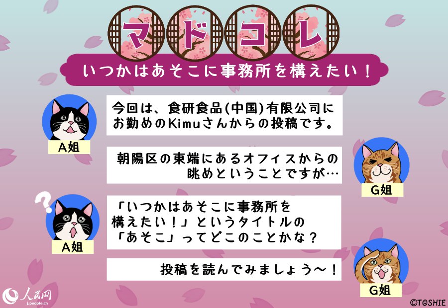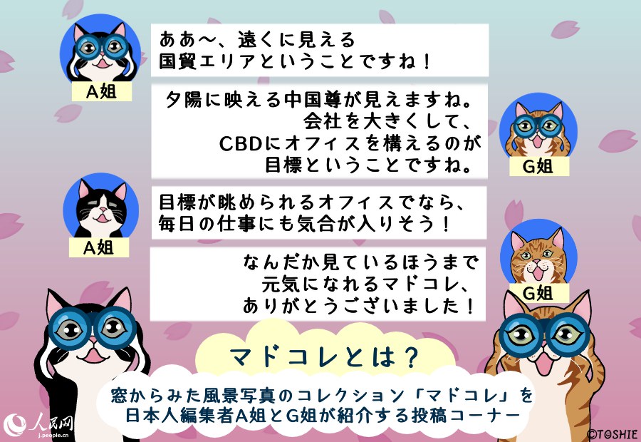 ウチのオフィスの窓からは、こんな風(fēng)景またはこんなモノが見(jiàn)えると自慢していただく「マドコレ(窓から見(jiàn)た風(fēng)景コレクション)」コーナー。どこまでも続く青い空や遠(yuǎn)くに見(jiàn)える山々といった自然の風(fēng)景から、オフィス街に建ち並ぶ高層ビルや幹線道路を走る車(chē)、庶民の暮らしが垣間見(jiàn)えるローカルな街並み、はたまた移動(dòng)中の車(chē)窓からの眺めなどなど、高さや場(chǎng)所も異なれば、その窓から眺める風(fēng)景も千差萬(wàn)別。中には仕事の意欲をアップさせてくれる元?dú)荬纬訾牍饩挨猡ⅳ欷小⑵¥欷虬Kしてくれるほっこりした風(fēng)景も。そんな皆さまからお寄せいただいたマドコレの數(shù)々を、毎週火曜日に、人民網(wǎng)日本人編集者のA姐とG姐がコメントしながら、のんびり紹介していきます。