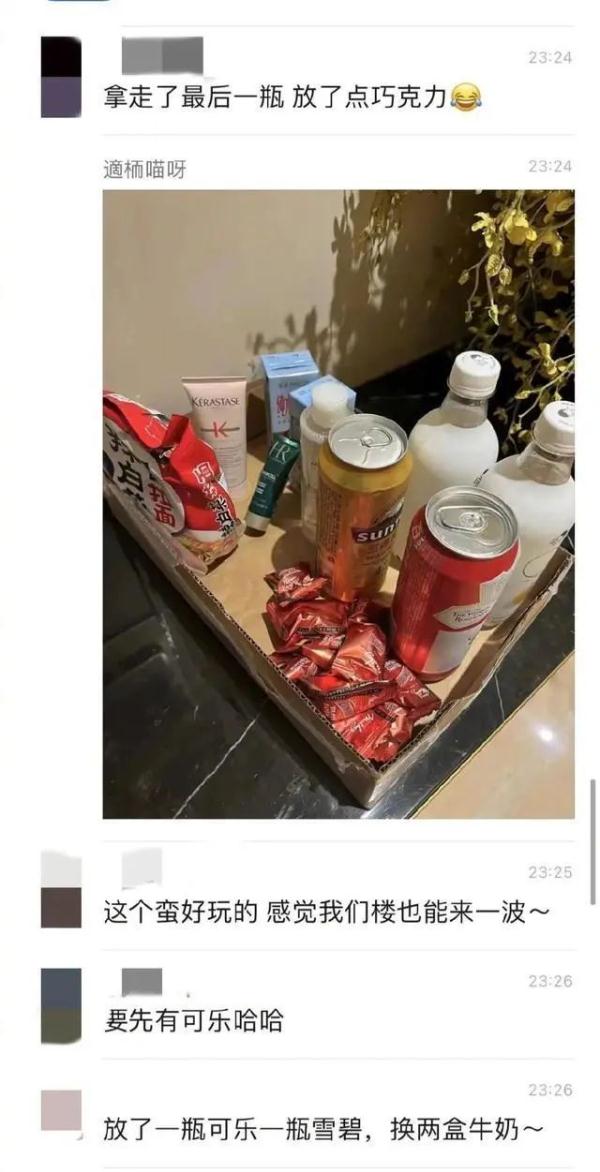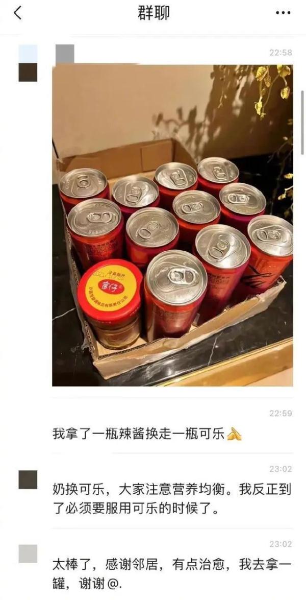 まず、1階ロビーに行ったのは男性の肖さんで、コーラ1缶を受け取った代わりに、唐辛子みそ1瓶を置いていき、微信(WeChat)のグループチャットに、「唐辛子みそ1瓶とコーラ1缶を交換しました」というメッセージを送った。続いてやって來(lái)たのは男性の毛さん。牛乳1本をコーラ1缶と交換し、「牛乳とコーラを交換しました。栄養(yǎng)バランスに注意しましょう」というメッセージを送った。