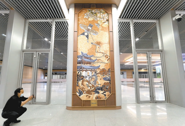 いたる所で北京の歴史、文化の要素を取り入れた裝飾品を目にすることができる駅構內(nèi)の様子(撮影?安旭東)。