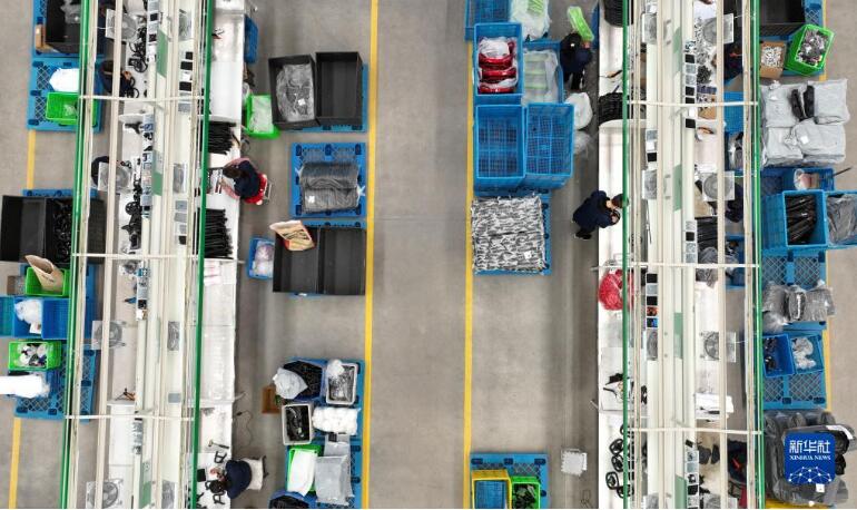 4月18日、安徽省滁州市の安徽全椒経済開発區(qū)にあるベビーカーメーカーの製造ラインで、従業(yè)員が忙しそうに働く様子。(撮影?沈果。ドローンで撮影)