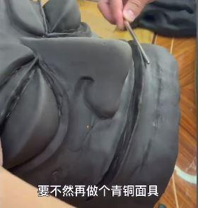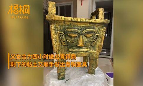 母親の趙さんによると、「デザインは娘がネット上で探し、粘土を使って自分で作り上げた。青銅鼎を作り終えた後に、まだ粘土が殘っていたので、力を合わせて『青銅の仮面』も作り上げた」という。