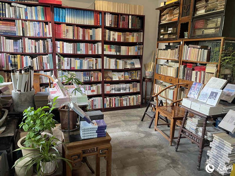 塔を囲むようにした敷地の南側(cè)と北側(cè)には北京の伝統(tǒng)建築様式である四合院風(fēng)の建物があり、そこが店舗になっている。書棚には本がぎっしりと並べられ、風(fēng)情のある家具の上にも平積みされている。