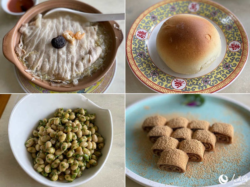 砂鍋居の看板料理「砂鍋白肉」と焼いたマントウ、香椿豆、驢打滾(撮影?勝又あや子)。
