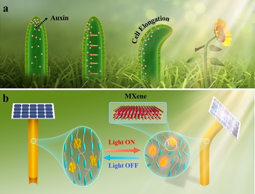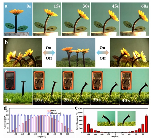 封氏の研究開発チームは、光重合性を持つ二次元MXeneナノ単體を設(shè)計?生成し、バックボーン型架橋液晶エラストマーへの光重合により、材料の機械的性能を大幅に強化するとともに、卓越した光駆動能力を持たせた。この新材料は植物の莖のように光が照射する方向に灣曲する上、三次元空間內(nèi)のすべての角度におけるスピーディな感知、連続的な追跡、自己適応による入射光との相互作用能力を持ち、光屈性植物の自己適応による光源の正確な追跡を?qū)g現(xiàn)した。