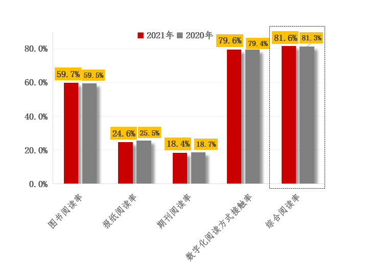 2021年、中國の成人の書籍の読書率は59.7%と、2020年と比べて0.2ポイント上昇した。デジタル化された読書スタイル(インターネット、スマートフォン、電子書籍リーダー、タブレットPCなどによる読書)の接觸率は79.6%と、2020年に比べて0.2ポイント上昇した。