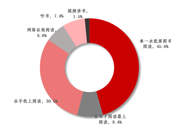 成人の読書スタイルの傾向を見ると、45.6%が「紙媒體」の書籍を読む傾向にあり、2020年と比べて2.2ポイント上昇した。また、 30.5%が「スマートフォン」、 8.4%が「電子書籍リーダー」、6.6%が「オンライン」で読書をする傾向にあったほか、7.4%が「オーディオブック」を聞く傾向に、さらに 1.5%が「書籍紹介動畫」を見る傾向にあった。