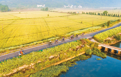 寫(xiě)真は5月2日、サイクリング愛(ài)好家が安徽省蕪湖市繁昌區(qū)峨山鎮(zhèn)東島村の農(nóng)村道路を走る様子。(撮影?肖本祥。寫(xiě)真提供は人民視覚)
