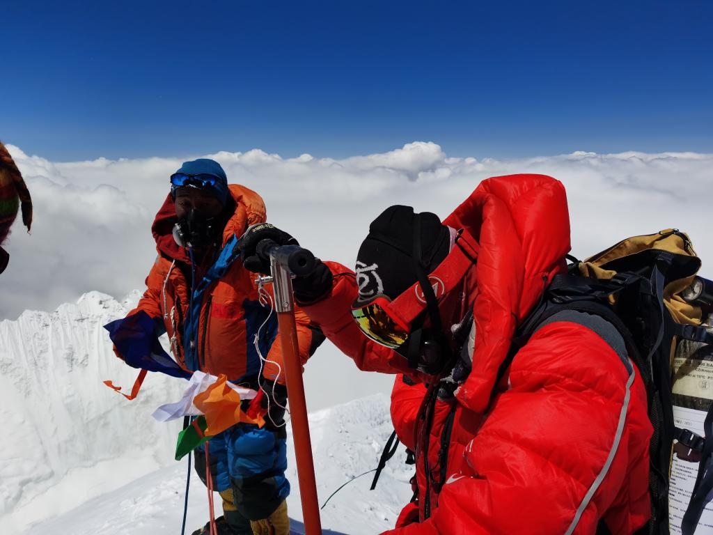 4日、チョモランマに登頂した科學(xué)調(diào)査隊(duì)員。撮影?索朗多吉