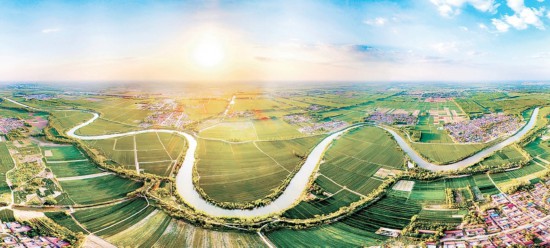 京杭大運(yùn)河の全線で通水が実現(xiàn)し、カーブの多い河北省滄州區(qū)間では、きれいな水の流れる河川が大きく蛇行し、その周りに木々が青々と茂っている(撮影?傅新春)。
