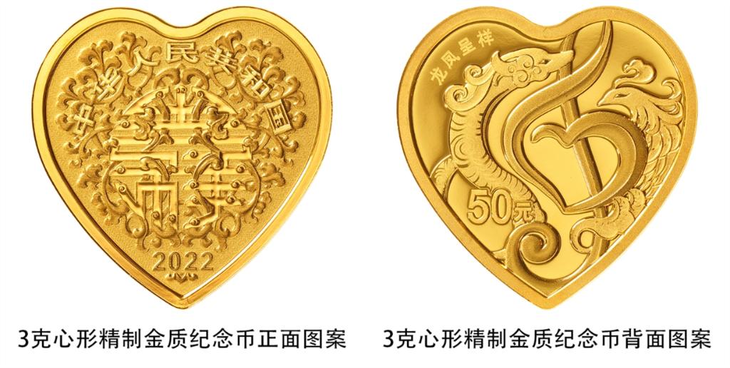 中國人民銀行(中央銀行)は13日、今月20日に、2022年版の金?銀の吉祥文化記念貨幣セットを発売すると発表した。竜と鳳凰が一緒に現(xiàn)れるほどのおめでたいことを願う「竜鳳呈祥」が描かれたハート型の金の記念硬貨の額面は50元(1元は約19円)で、重さは3グラム。2萬枚限定だ?!父o鳳呈祥」が描かれたハート型の銀の記念硬貨の額面は10元で、重さは30グラム。5萬枚限定となっている。(編集KN)