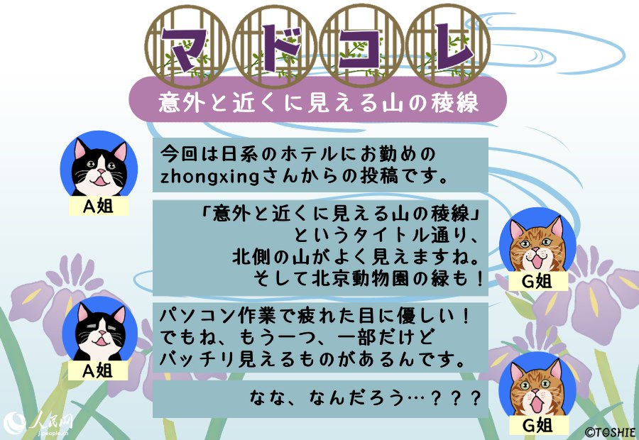 ウチのオフィスの窓からは、こんな風景またはこんなモノが見えると自慢していただく「マドコレ(窓から見た風景コレクション)」コーナー。どこまでも続く青い空や遠くに見える山々といった自然の風景から、オフィス街に建ち並ぶ高層ビルや幹線道路を走る車、庶民の暮らしが垣間見えるローカルな街並み、はたまた移動中の車窓からの眺めなどなど、高さや場所も異なれば、その窓から眺める風景も千差萬別。中には仕事の意欲をアップさせてくれる元気の出る光景もあれば、疲れを癒してくれるほっこりした風景も。そんな皆さまからお寄せいただいたマドコレの數(shù)々を、毎週火曜日に、人民網(wǎng)日本人編集者のA姐とG姐がコメントしながら、のんびり紹介していきます。