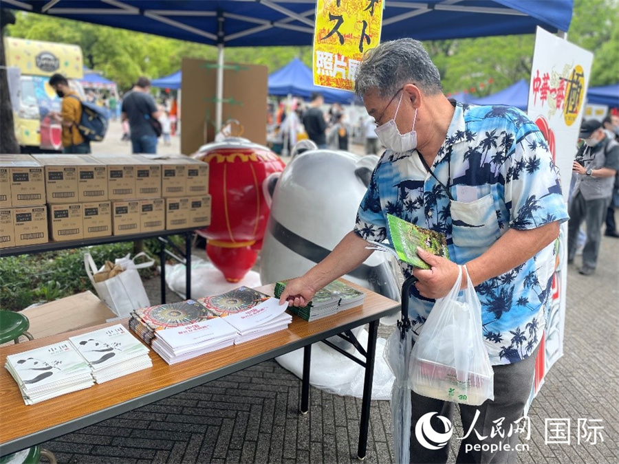 5月14日、中國(guó)駐東京観光代表処が「四川フェス」に設(shè)置したブースで足を止め、資料を手に取る日本人來(lái)場(chǎng)者(撮影?呉頴)。