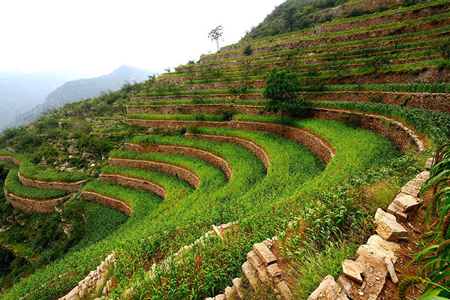 河北省邯鄲市渉県の乾地農(nóng)業(yè)石堰棚田システムは中國(guó)北部の河北省で行なわれ、雨水農(nóng)業(yè)システムとして、その歴史は13世紀(jì)まで遡る?,F(xiàn)地は山間部の乾燥した気候で、自然環(huán)境は厳しいが、石堰棚田が急斜面を利用した農(nóng)業(yè)の條件を整え、現(xiàn)代に至るまで重要な役割を果たし続けている?,F(xiàn)地の人々が安定した生活を送れるようにするとともに、土壌が少なく降水量も少ない北方の石灰?guī)r質(zhì)の山間部におけるエコ循環(huán)型の持続可能な農(nóng)業(yè)のモデルを作り出した。