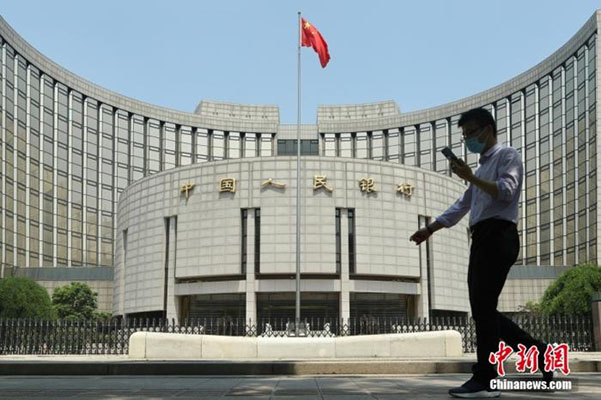 北京市にある中國人民銀行の前を通り過ぎる市民。(撮影?蔣啓明)