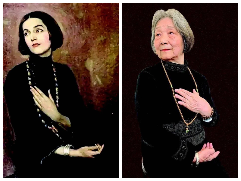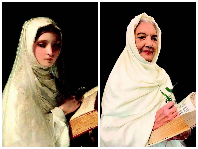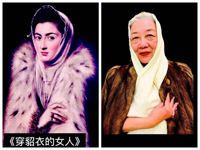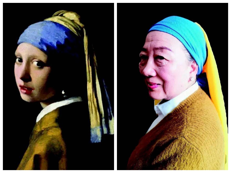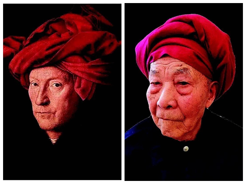 「赤いターバンの男の肖像」に扮した文さん(90)は、ムスッとした自分の顔が絵にそっくりなので、その絵を選んだという。赤いターバンを頭に巻いただけの「変身」には5分もかからなかったというが、名畫そっくりの自分の姿を見て、思わず笑顔を浮かべて子供のようにカメラを前にピースを連発したという。