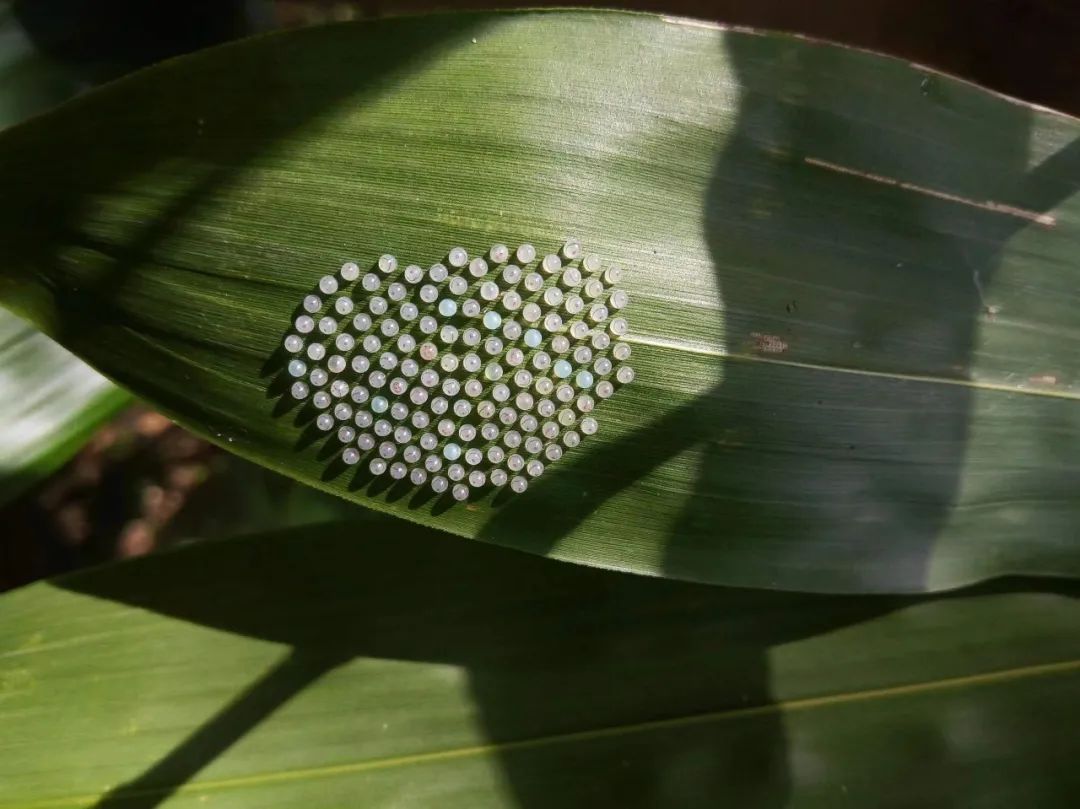 2020年、紅河ハニ族イ族自治州金平県の蝴蝶谷でハート形に産み付けられたルイザワモンチョウの卵(撮影?楊鎮(zhèn)文)。