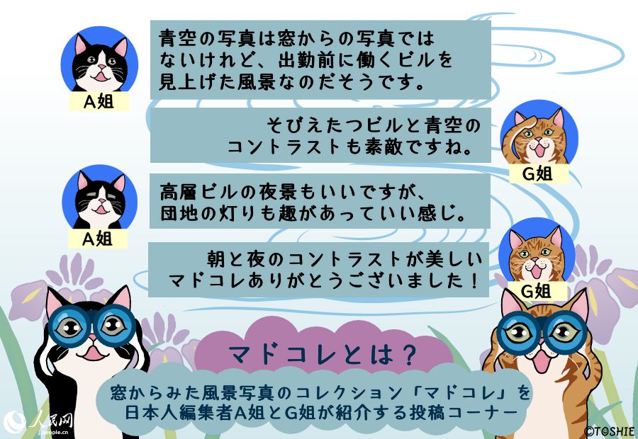 ウチのオフィスの窓からは、こんな風(fēng)景またはこんなモノが見(jiàn)えると自慢していただく「マドコレ(窓から見(jiàn)た風(fēng)景コレクション)」コーナー。どこまでも続く青い空や遠(yuǎn)くに見(jiàn)える山々といった自然の風(fēng)景から、オフィス街に建ち並ぶ高層ビルや幹線道路を走る車、庶民の暮らしが垣間見(jiàn)えるローカルな街並み、はたまた移動(dòng)中の車窓からの眺めなどなど、高さや場(chǎng)所も異なれば、その窓から眺める風(fēng)景も千差萬(wàn)別。中には仕事の意欲をアップさせてくれる元?dú)荬纬訾牍饩挨猡ⅳ欷小⑵¥欷虬Kしてくれるほっこりした風(fēng)景も。そんな皆さまからお寄せいただいたマドコレの數(shù)々を、毎週火曜日に、人民網(wǎng)日本人編集者のA姐とG姐がコメントしながら、のんびり紹介していきます。