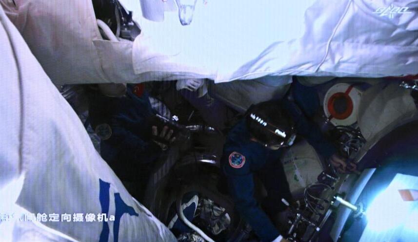 陳冬飛行士がコアモジュール「天和」のハッチを開(kāi)く様子。