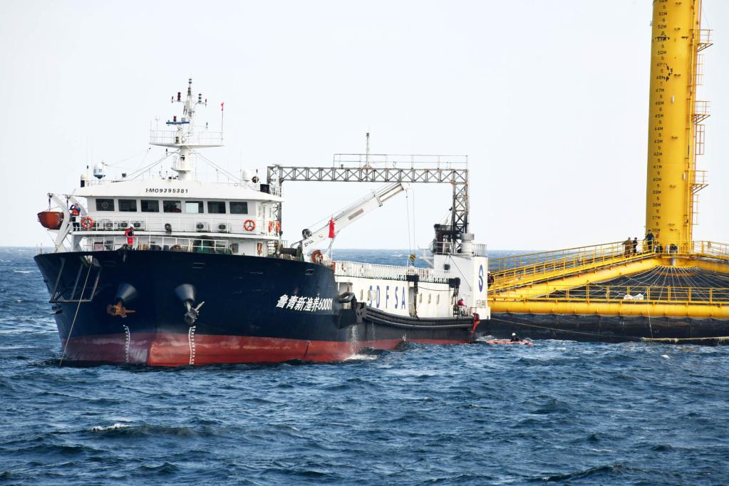 7日、青島國(guó)家深遠(yuǎn)海グリーン養(yǎng)殖試験エリアの「深藍(lán)1號(hào)」。( 撮影?李紫恒)