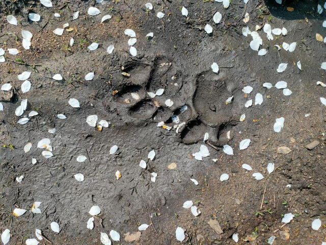 5月30日にアムールトラ?ヒョウ國家公園穆棱パーク區(qū)內で撮影された「完達山1號」の足跡(寫真提供?取材対応者)。