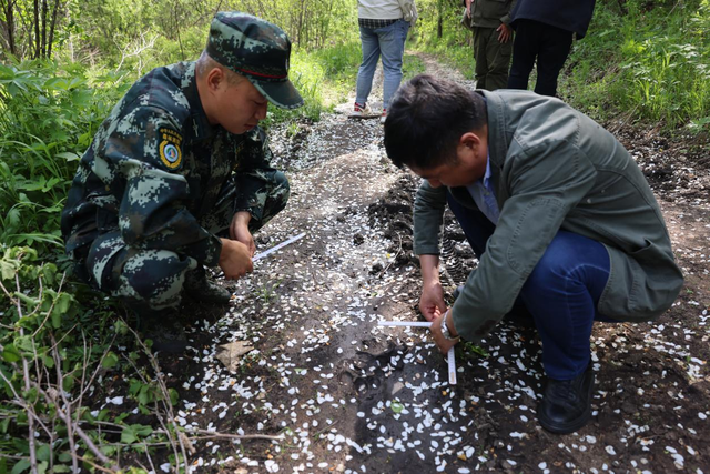 5月30日、「完達山1號」の足跡の大きさを測る職員(寫真提供?取材対応者)。