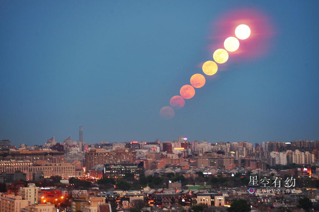 天文愛好家の王俊峰氏が2017年4月11日に北京で撮影した満月が昇る様子(多重露光)。(畫像提供は本人)