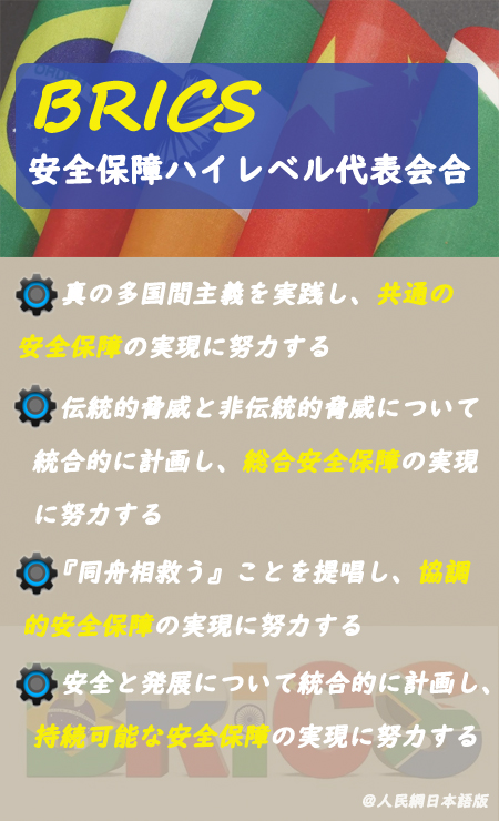 「新興國と発展途上國の集団的臺頭という歴史的な大きなうねりの中で誕生したBRICSは、世界構(gòu)造と國際秩序の変化と調(diào)整が向かう方向を代表している。時代の潮流に順応し、時代の変化に適応し、激動する國際情勢にさらに多くの安定性とプラスのエネルギーを與える必要がある。真の多國間主義を?qū)g踐し、共通の安全保障の実現(xiàn)に努力し、伝統(tǒng)的脅威と非伝統(tǒng)的脅威について統(tǒng)合的に計畫し、総合安全保障の実現(xiàn)に努力し、『同舟相救う』ことを提唱し、協(xié)調(diào)的安全保障の実現(xiàn)に努力し、安全と発展について統(tǒng)合的に計畫し、持続可能な安全保障の実現(xiàn)に努力する必要がある」と強調(diào)した。