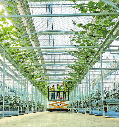 人工知能(AI)、5G技術(shù)による制御、水?肥料散布一體型機械……済源市梨林鎮(zhèn)スマート農(nóng)業(yè)野菜産業(yè)モデルパークは毎年、果物と野菜を185萬キログラム生産する。