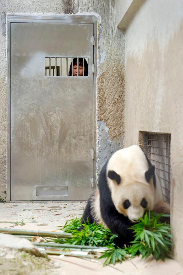 6月21日、エサを食べるパンダを見守る郎舜筠さん(撮影?瀋伯韓)。