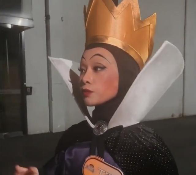この存在感抜群の「女王」は、ディズニーランドのミュージカルショー「ディズニーヴィランズ継母たちの秘密の女子會(huì)!」に出演しているキャスト。練習(xí)があり、メイクを落とす暇もなかったため、ショーの衣裝のままPCR検査を受けに來たという。