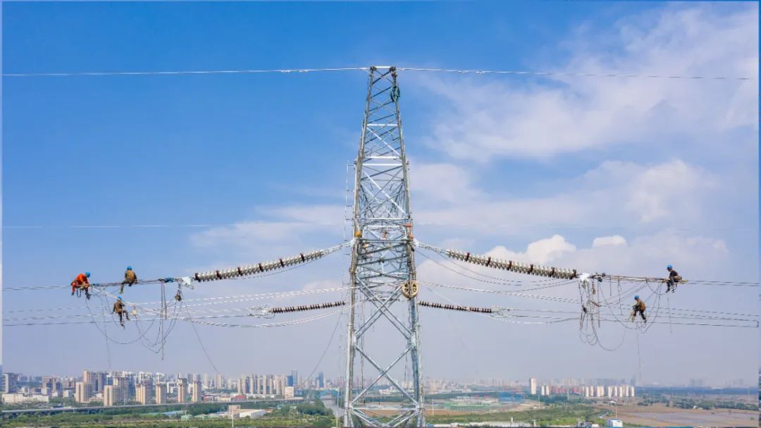 6月15日、130メートル余りの電線を架設する江蘇送変電有限公司の工事作業(yè)員。撮影?史俊