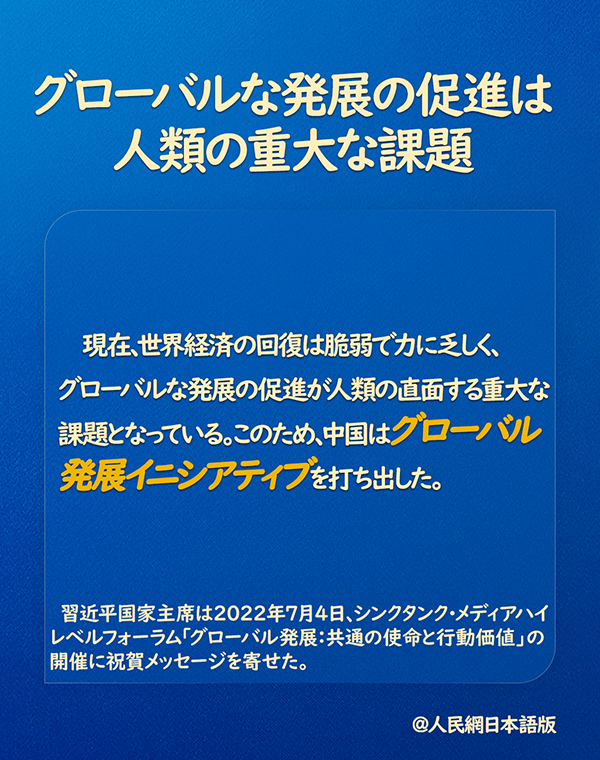 習(xí)主席は「現(xiàn)在、世界では百年間なかった変動(dòng)と新型コロナウイルス感染癥が重なり合い、世界経済の回復(fù)は脆弱で力に乏しく、南北の発展格差はさらに拡大し、世界は新たな激動(dòng)と変革の時(shí)期に入り、グローバルな発展の促進(jìn)が人類の直面する重大な課題となっている。このため、中國(guó)はグローバル発展イニシアティブを打ち出した。中國(guó)は世界各國(guó)と共に、人々を中心とすることを堅(jiān)持し、インクルーシブネス、イノベーション主導(dǎo)、人と自然の調(diào)和ある共生を堅(jiān)持し、発展を國(guó)際的な優(yōu)先的アジェンダとする後押しをし、國(guó)連の『持続可能な開(kāi)発のための2030アジェンダ』の実行を加速し、より力強(qiáng)く、グリーンで、健全なグローバル発展の実現(xiàn)を後押しすることを望んでいる」と強(qiáng)調(diào)した。