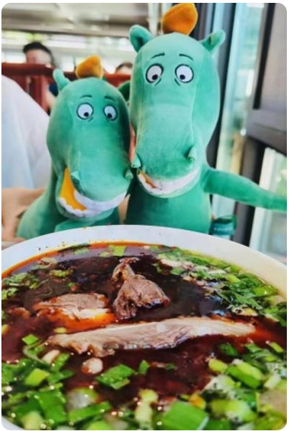 「銅奔馬」のぬいぐるみと牛肉麺の「ツーショット」 (寫真提供?取材対応者)。
