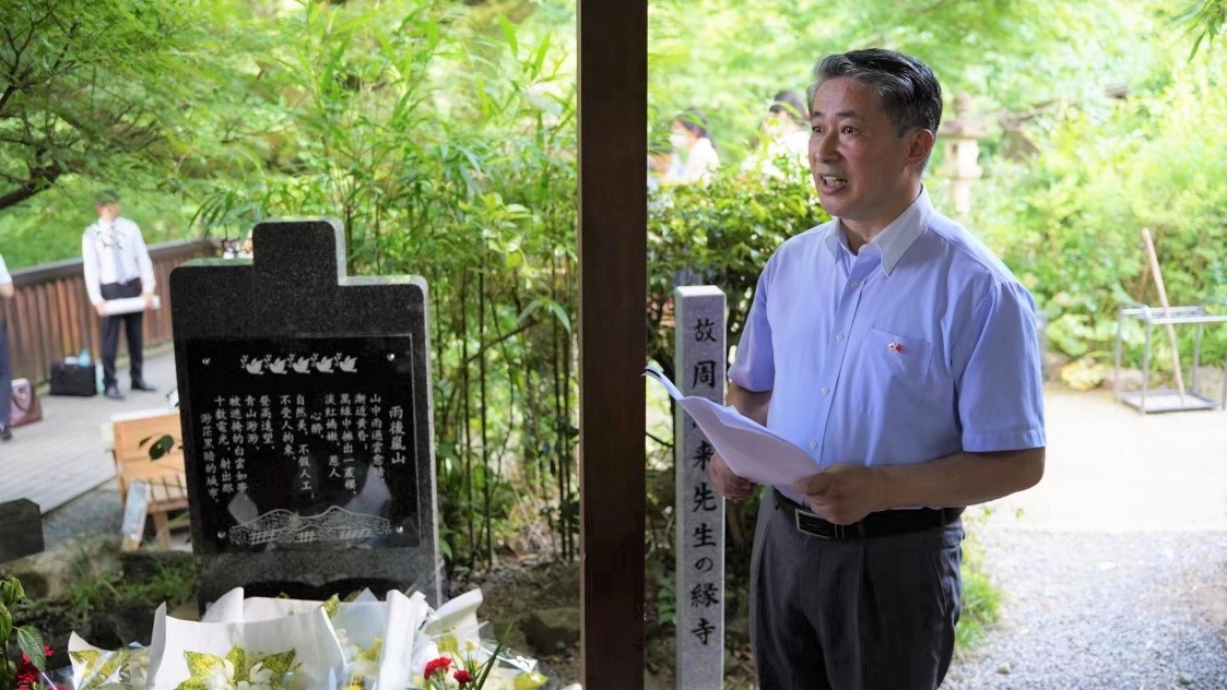 6月30日、周総理の「雨後嵐山」の詩碑を仰ぎ見る記念イベントで挨拶する京都府日中友好協(xié)會の田中彰壽代表(寫真提供?青城)。