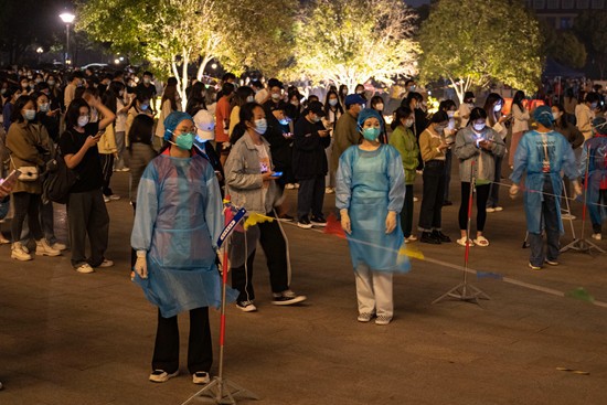 4月4日、ライトが燈された南京伝媒學(xué)院の運動場に設(shè)置されたPCR検査場で案內(nèi)役を務(wù)める學(xué)生ボランティア。