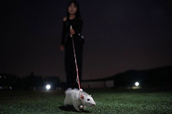 6月1日、學(xué)校の運動場でハムスターを散歩させる女子大生。