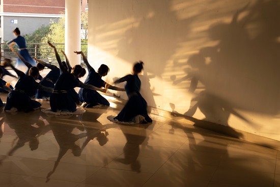 3月29日、廊下でダンスの授業(yè)を受ける舞蹈學(xué)科の學(xué)生。新型コロナウイルス対策のため、ほとんどの授業(yè)がオンラインに切り替えられ、舞蹈學(xué)科にとっては困難な時期となった。