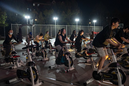 4月5日、新型コロナウイルス感染癥の影響で、校內(nèi)の商業(yè)広場內(nèi)に設(shè)けられていたジムから屋外に移されたエアロバイク。
