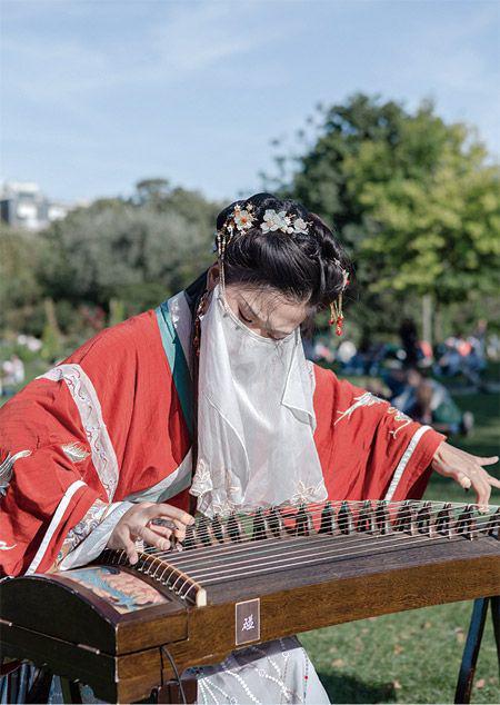 フランスの街中で中國(guó)テイスト漂わせ、古箏を演奏する中國(guó)人女性