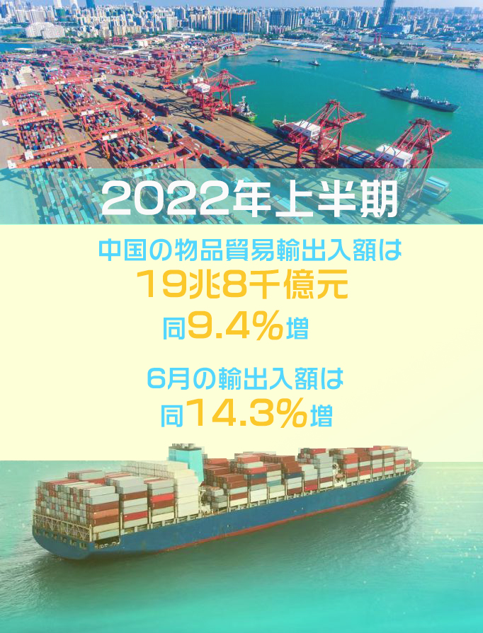 稅関総署が13日に発表したデータによると、2022年上半期には中國の物品貿(mào)易輸出入額が前年同期比9.4%増の19兆8千億元(1元は約20.4円)に上った。そのうち輸出は同13.2%増の11兆1400億元、輸入は同4.8%増の8兆6600億元だった。