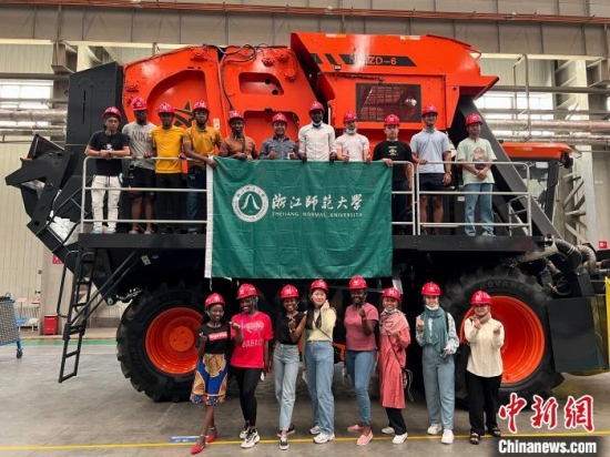 綿花収穫機と記念寫真を撮影する留學(xué)生ら。(畫像は浙江師範(fàn)大學(xué)が提供)